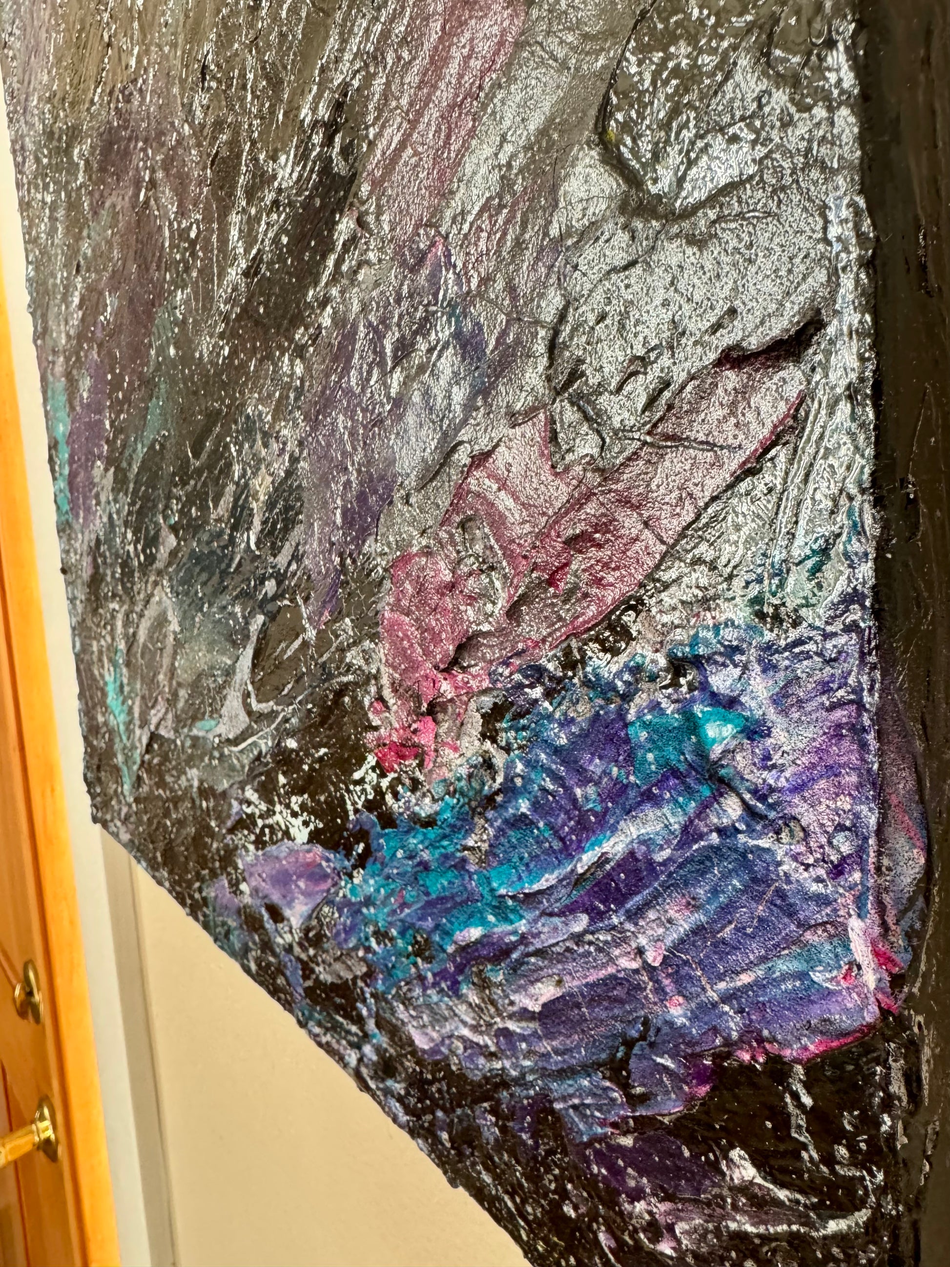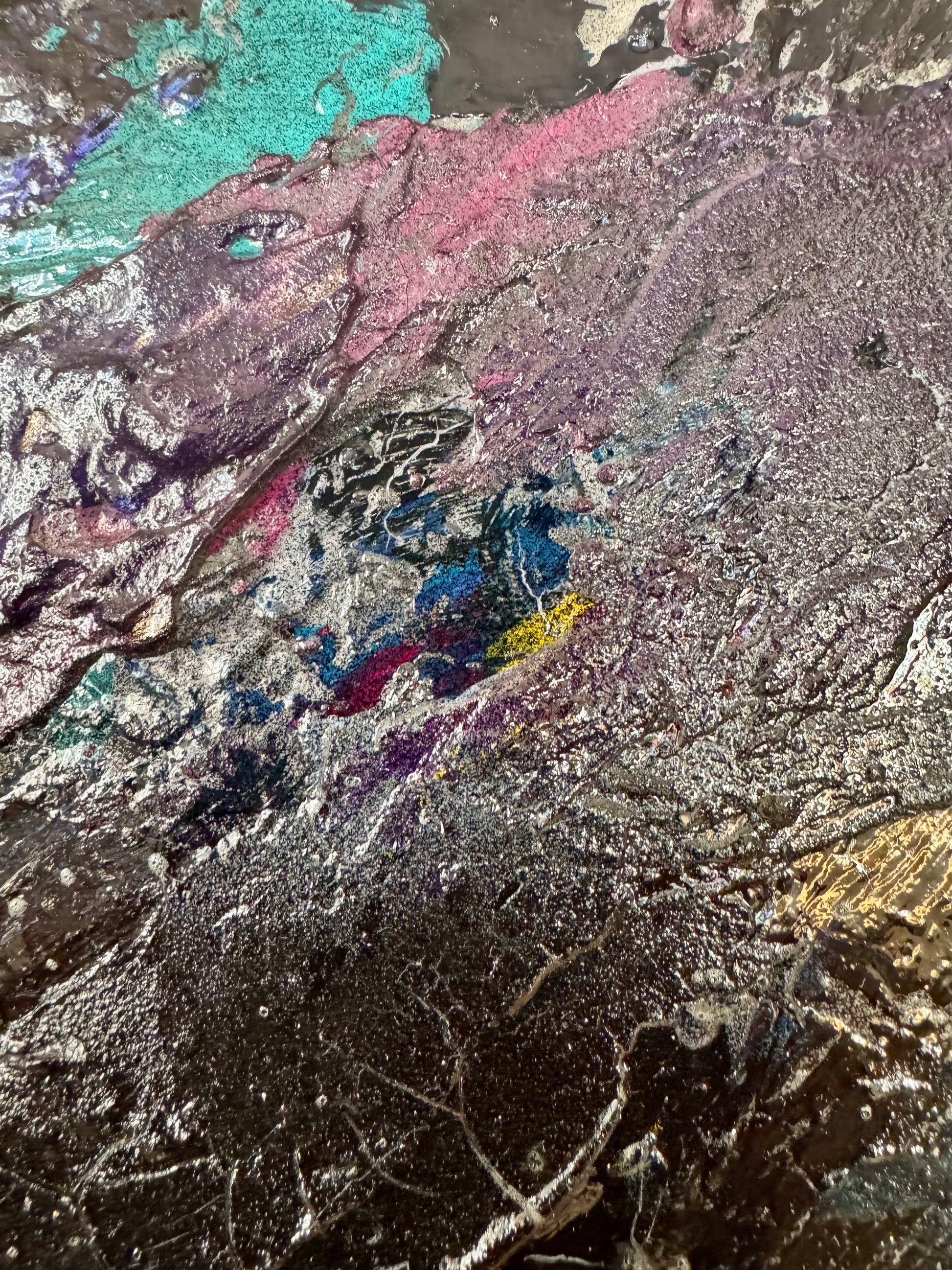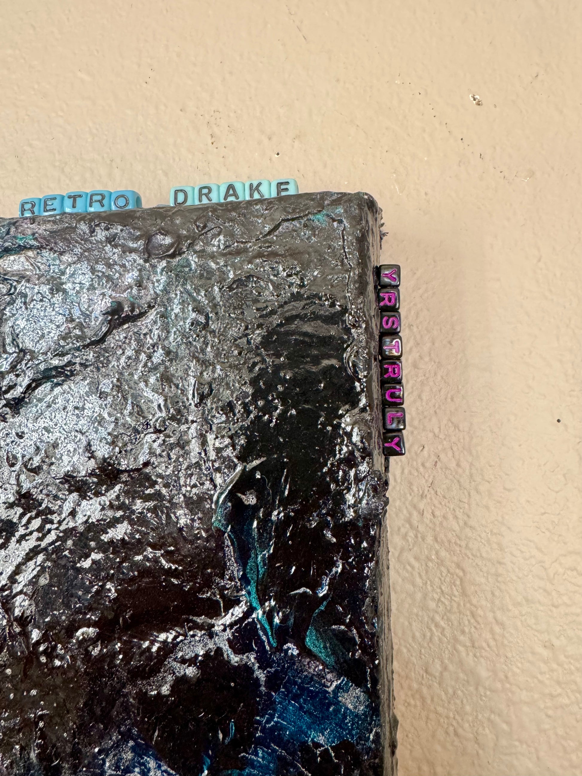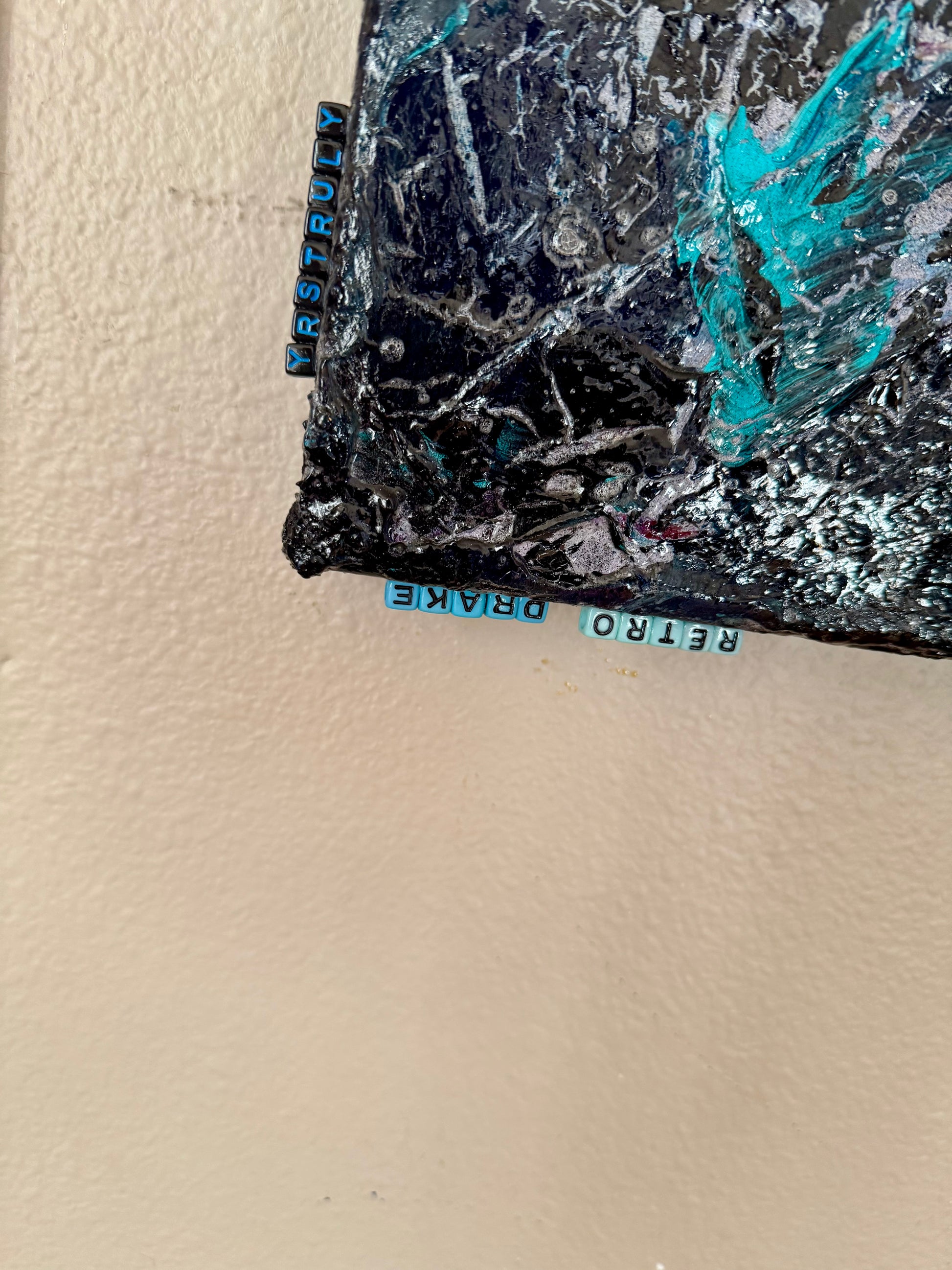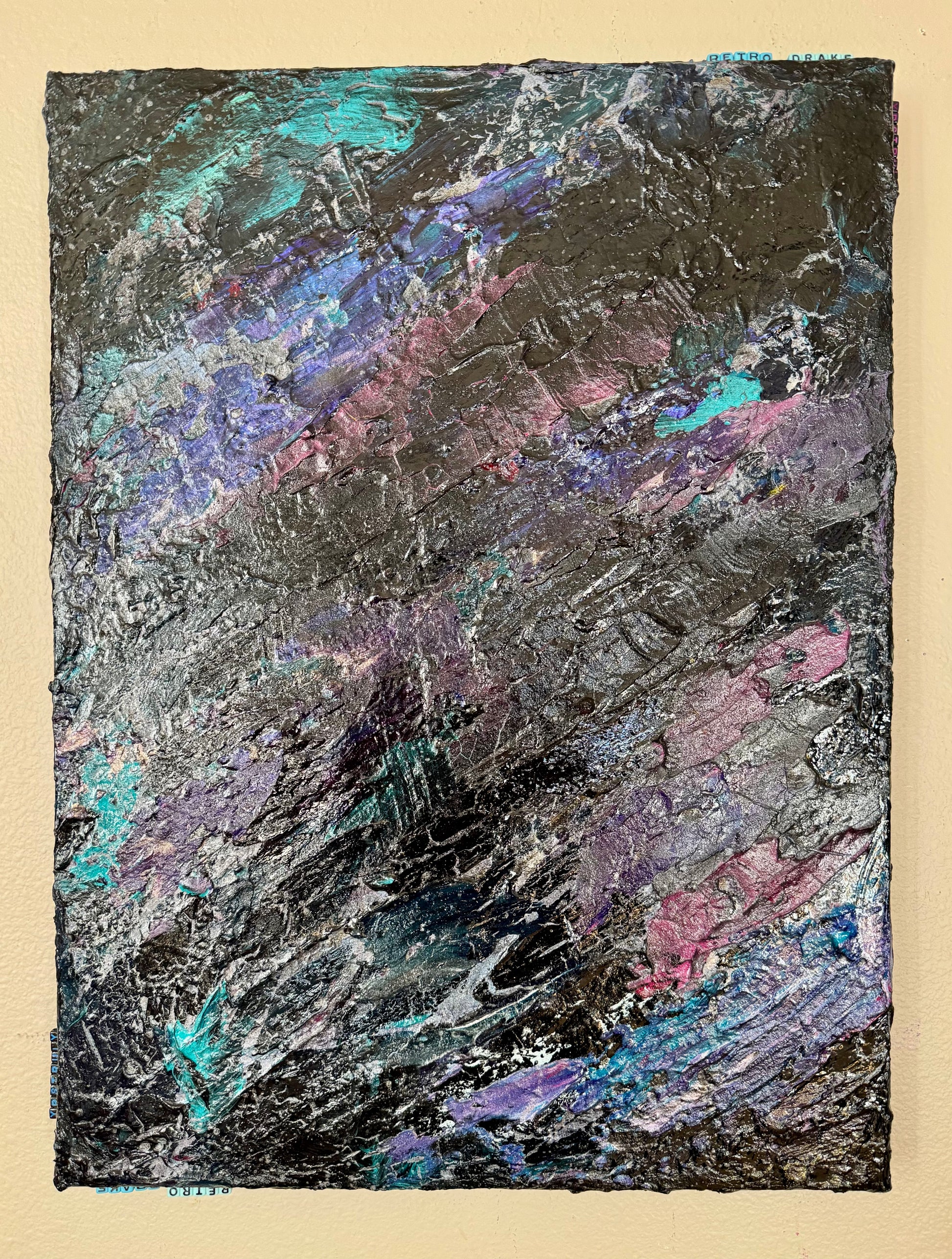 Step back in time with Retro Drake, an electrifying 18x24 piece by Gabriel LTA. This textured masterpiece bursts with an unmistakable 80s aesthetic, weaving together dynamic splashes of teal, neon pink, electric purple, and hints of metallic shimmer. The painting’s layered, gritty texture enhances its energy, evoking the vibe of vintage arcades, neon-lit streets, and retro-futuristic dreams.