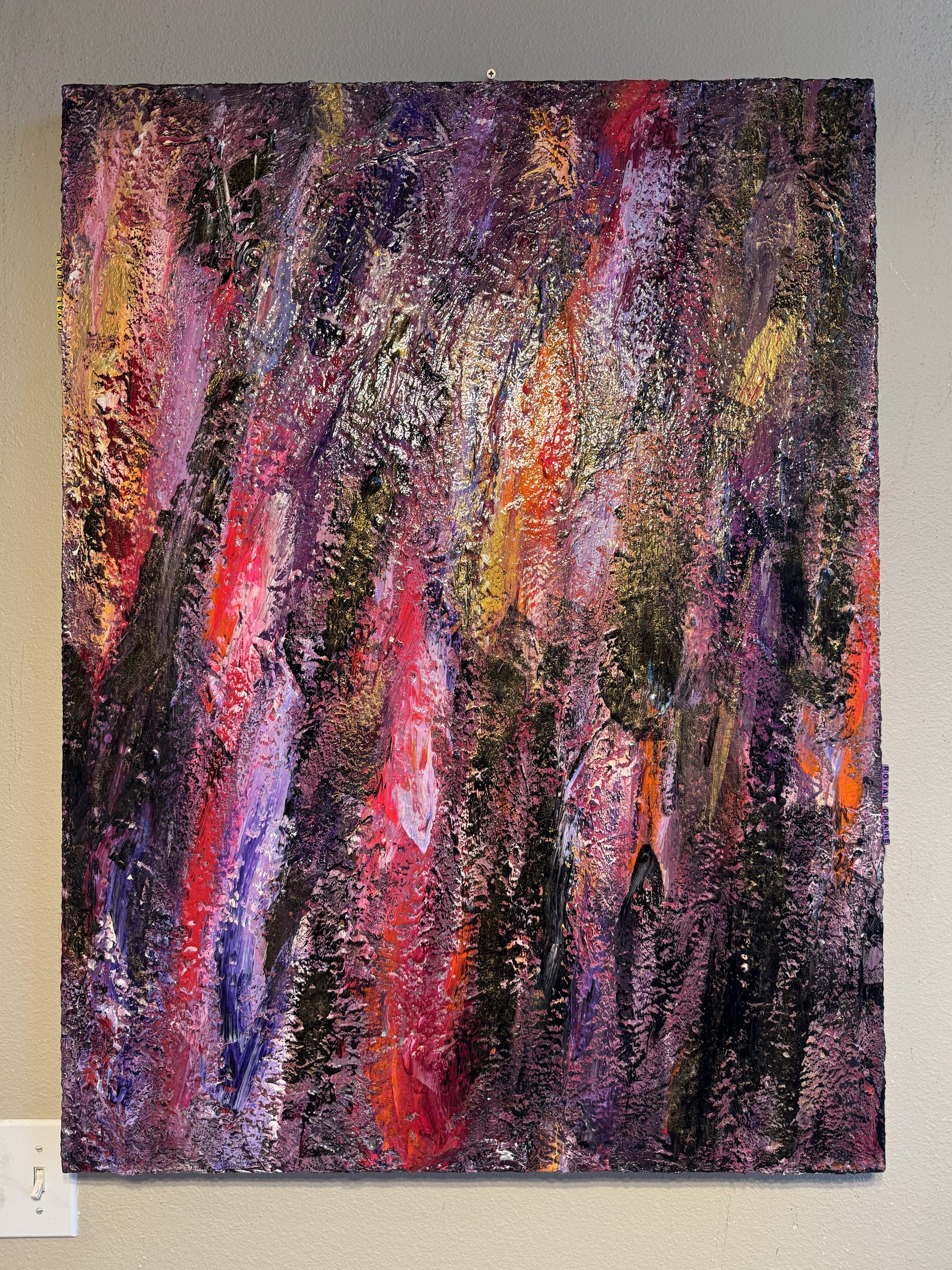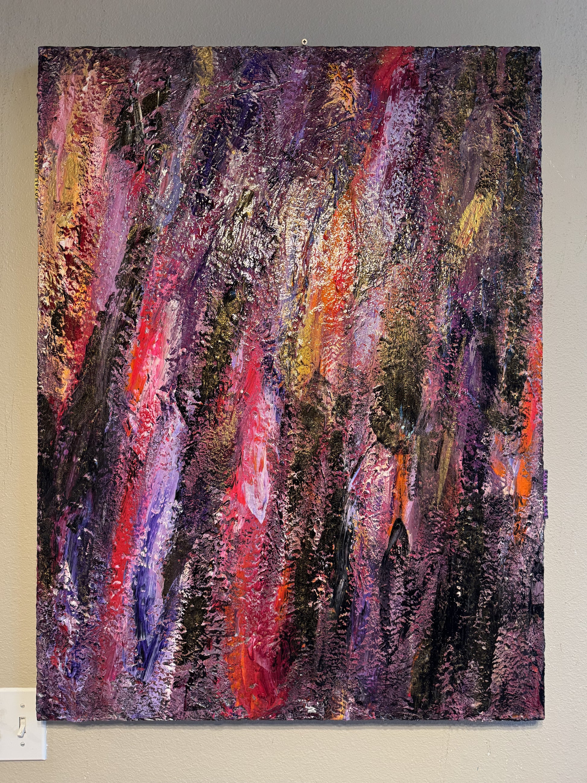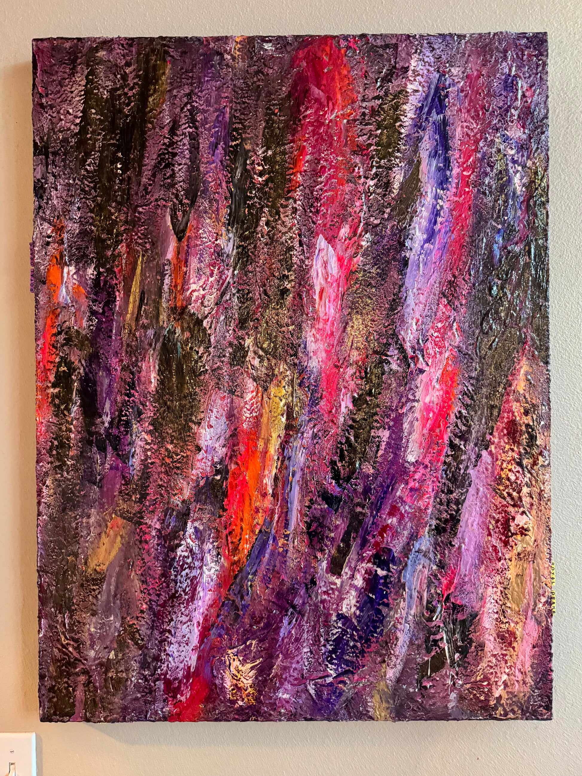 Royal Drake is an ode to the enduring regality of high-fantasy’s most illustrious houses, where legacy and honor converge in vivid splendor. This piece weaves a tapestry of deep purples and majestic golds, accented by bold flashes of crimson and bright violet, evoking the fire and passion of noble bloodlines. Each textured layer tells a story of tradition, resilience, and power, capturing the spirit of dynasties that rule with grace and determination.